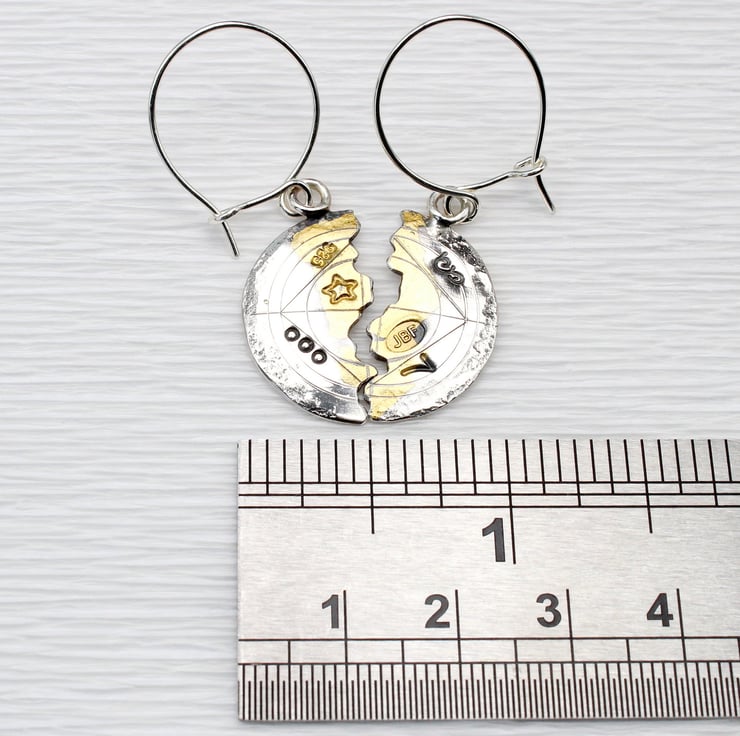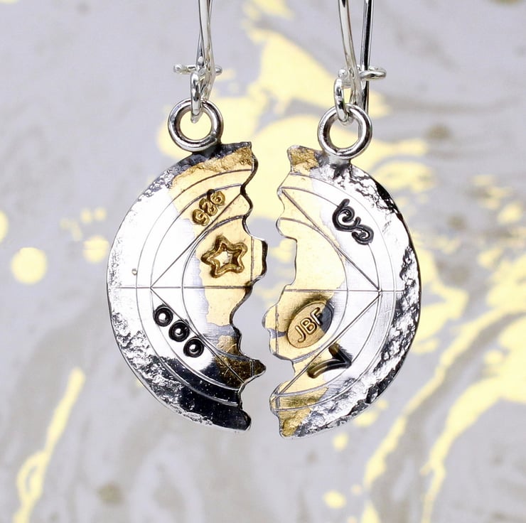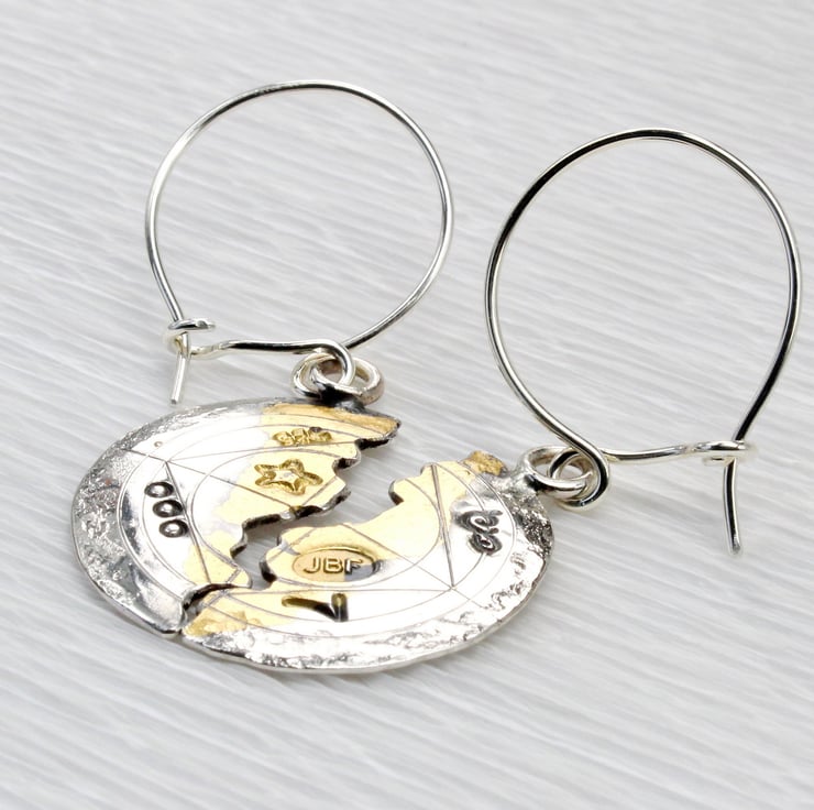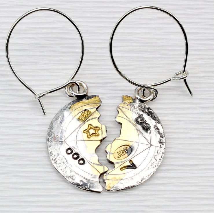 These wonderful halved earrings are made from sterling silver and 24-carat gold. These are the smaller of two pairs of scribed halved earrings we make. The technique used is an ancient Korean one called Keum boo, where gold is fused to silver. Letters and symbols have been punched into the surface by hand, so each pair will differ slightly. The surface of the earrings has been scribed and is given a worn effect to simulate the look of an antique found object. When fitted together, the earrings measure 23mm in diameter.