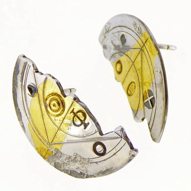 These unique, halved ear studs are made from 24ct gold and sterling silver. The technique used is an ancient Korean one caller Keum boo, where gold is fused to silver. Typography is an influence with this particular range of jewellery, and letters and symbols have been punched into the surface by hand, making each pair slightly different. The surface of the earrings is given a worn effect to simulate the look of an antique found object. When fitted together, the earrings measure 23mm in diameter. The posts and backs are made from sterling silver.