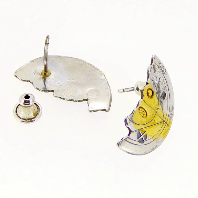 Halved ear studs, Keum boo ear studs, geometric, silver and gold, handmade