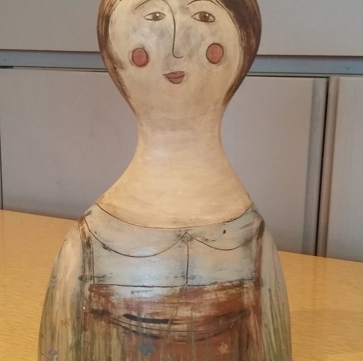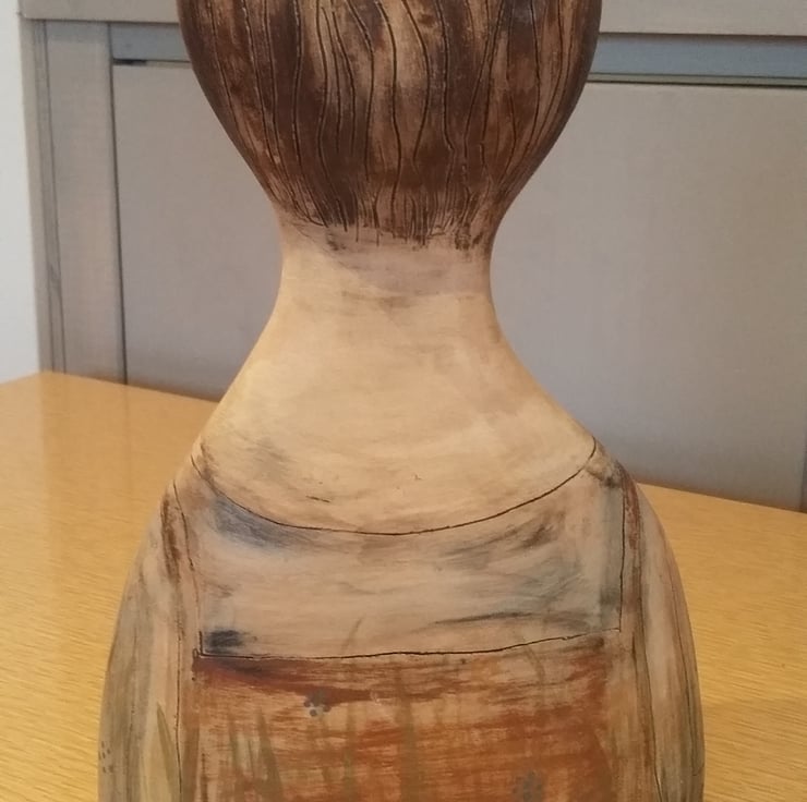 Made of earthenware clay this figurative ceramic sculpture measures 38 cm. Painted and drawn with coloured slips.