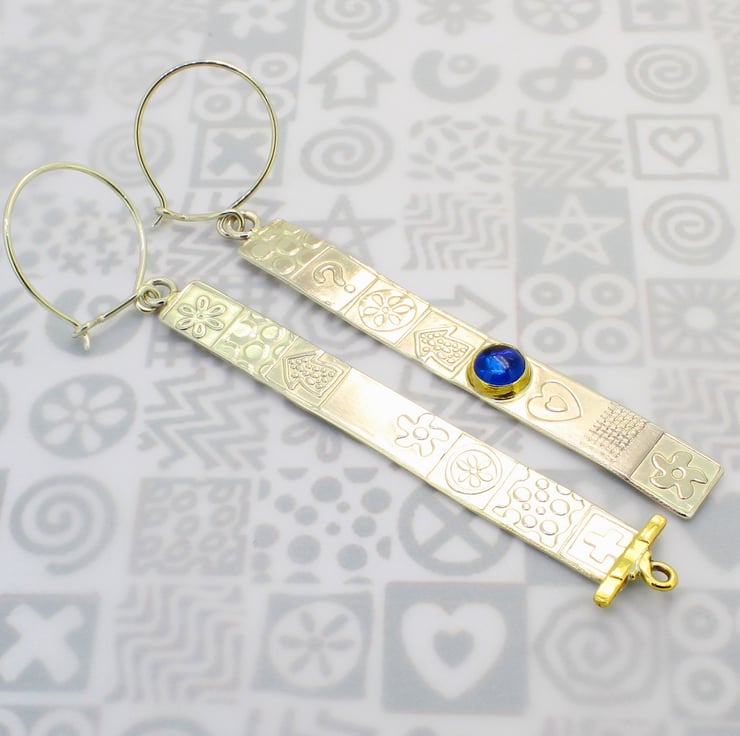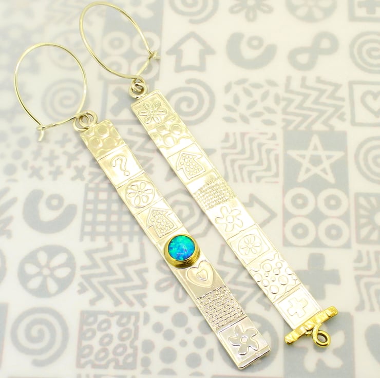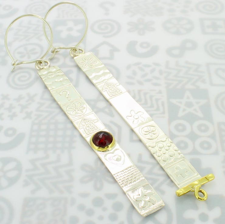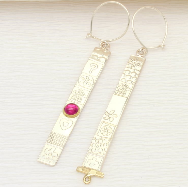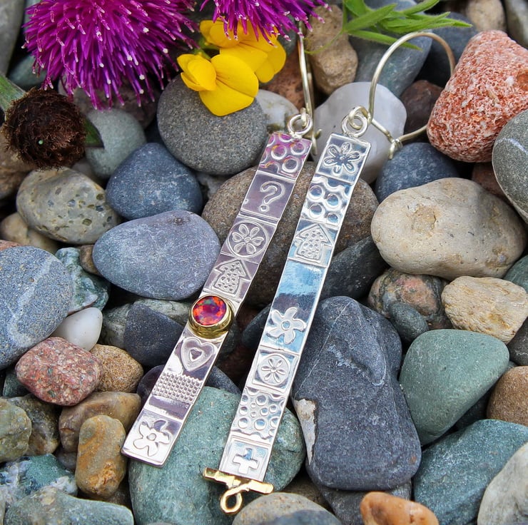 These elegant, long earrings come deliberately mismatched, one with a gemstone and one with some brass decoration. We design and make the stencils and emboss them by hand into sterling silver to create an interesting surface pattern. These earrings are handmade from sterling silver and feature one of our wonderful lab. grown red opal triplet stones set in a brass bezel, the other earring features some brass decoration to balance the pair. They measure 7mm x 60mm and hang on sterling silver ear wires.