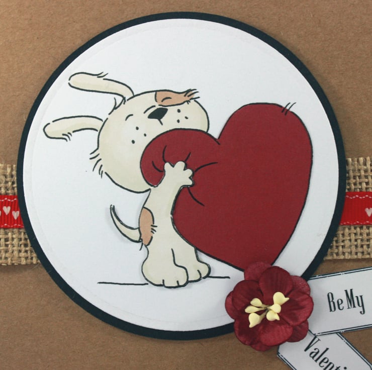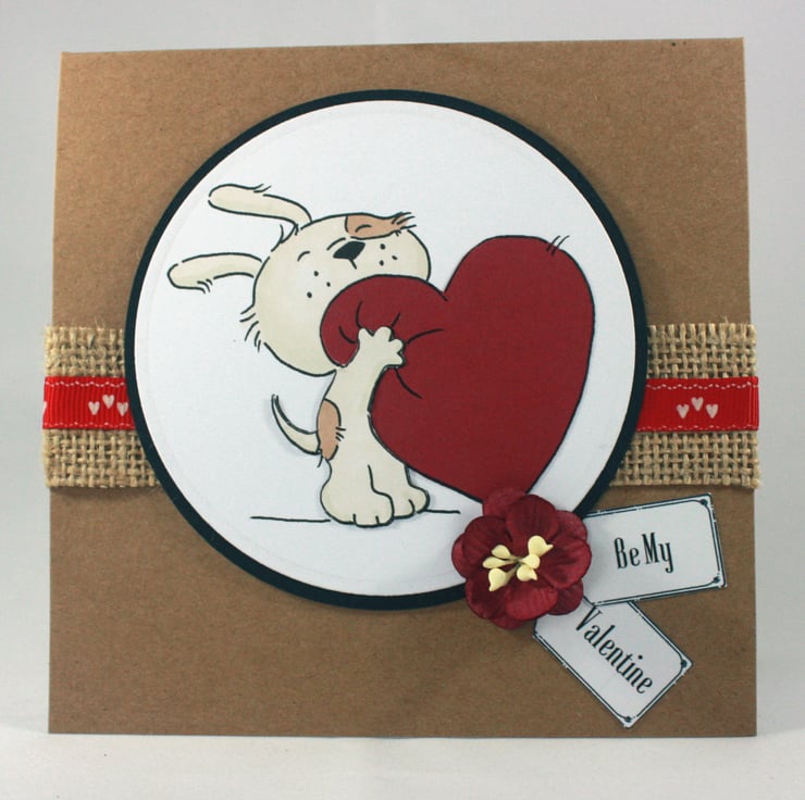 The card is embellished with a red paper flower and tags reading 'Be My Valentine'.