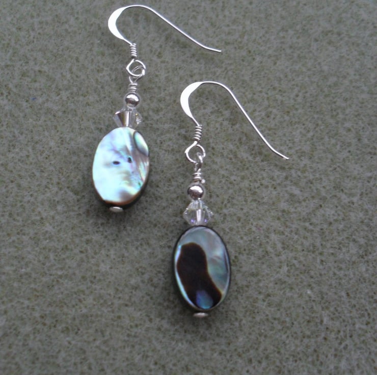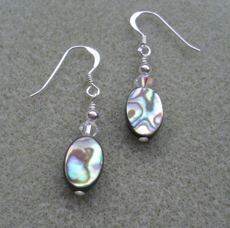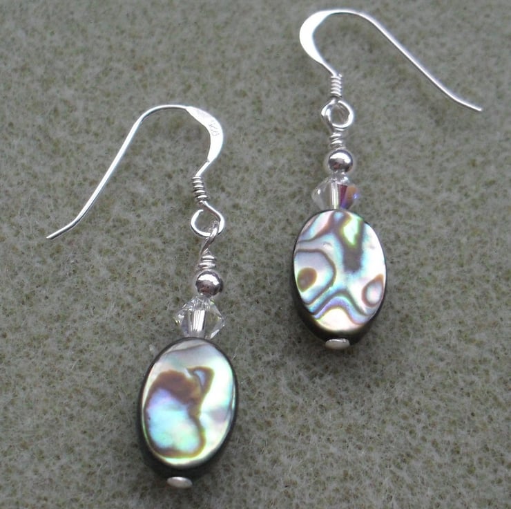 Sterling silver earrings with abalone shell and swarovski aurora borealis crystals which give a little sparkle and a rainbow of colour in the light.