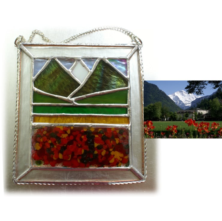 Photos 1 -4 are of this suncatcher . The 5th picture shows the previous and first I made to this design, now sold and also a photo of a beautiful view i took in Interlaken in 2007 which I used as the basis for my design.