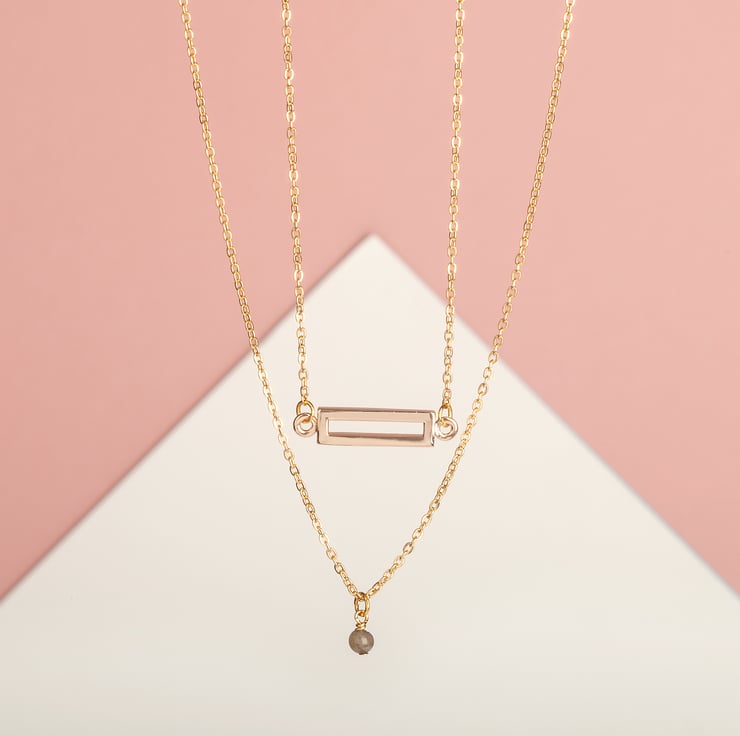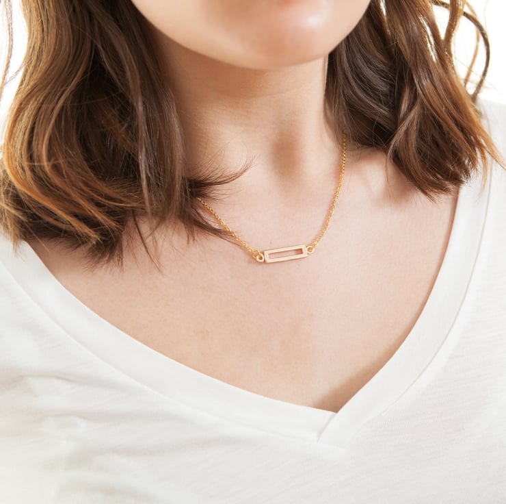 The shortest necklace is a high-shine, hollow rectangle bar fixed at either side to delicate cable chain. Simple geometric and minimalist.