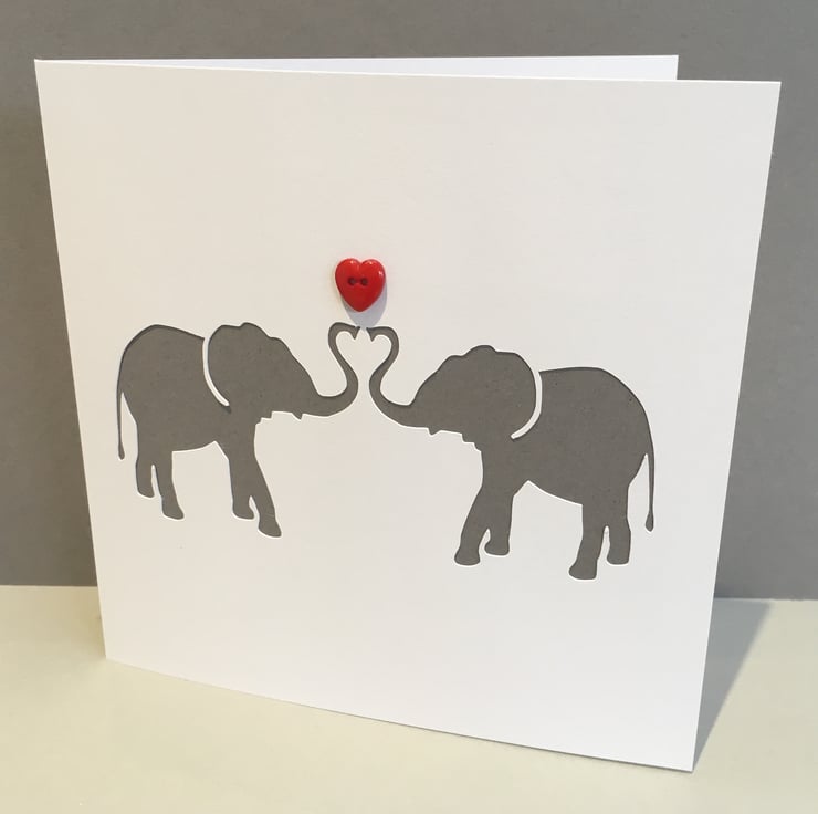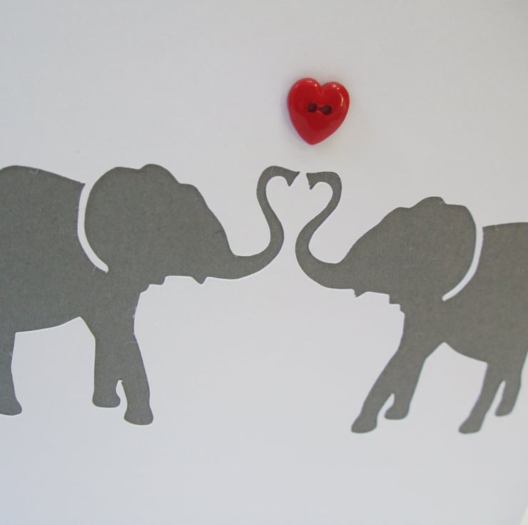 These sweet paper cut elephants have trunks curled in the shape of a heart, with a button heart above them to add a little colour to this cute valentine or anniversary card for a loved one.