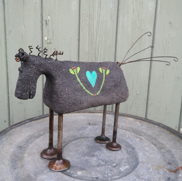 Horse sculpture from the Station Cat Pottery...handmade in a high fired clay, his mane and tail are wire and his legs are recycled engine valves.