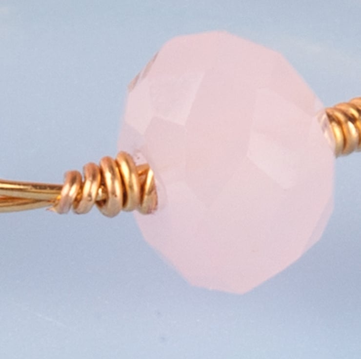 Thin gold wire, wrapped and shaped by hand to form a skinny ring band and is bound around a multi-faceted rose pink stone.