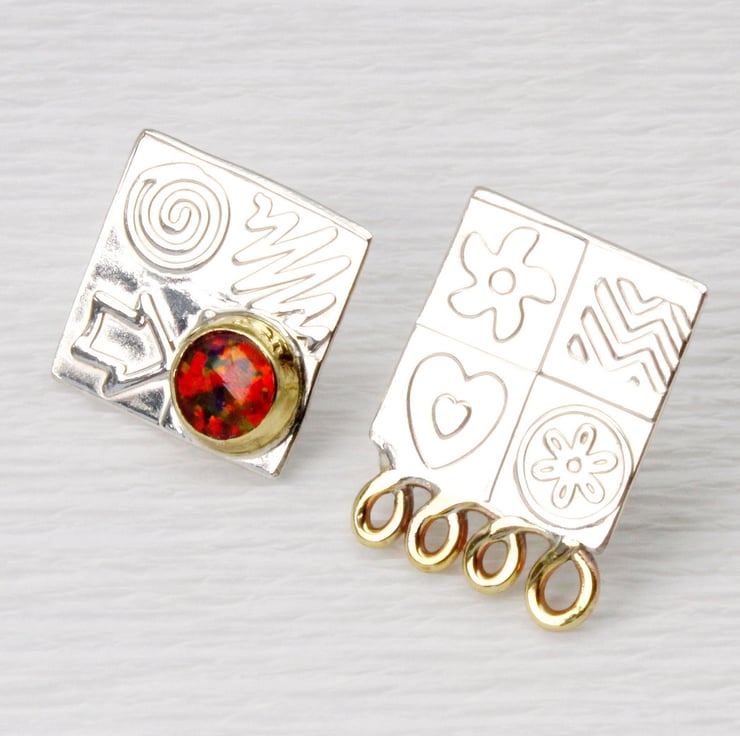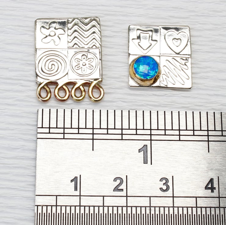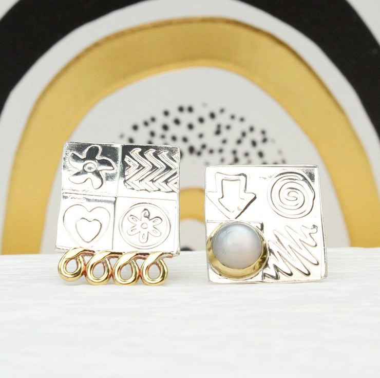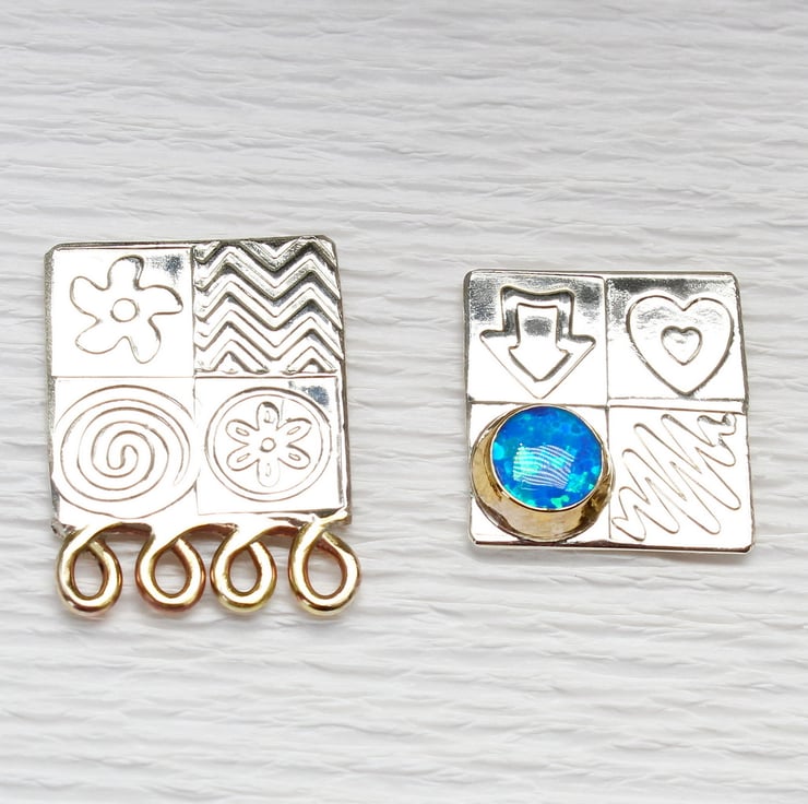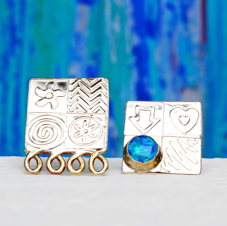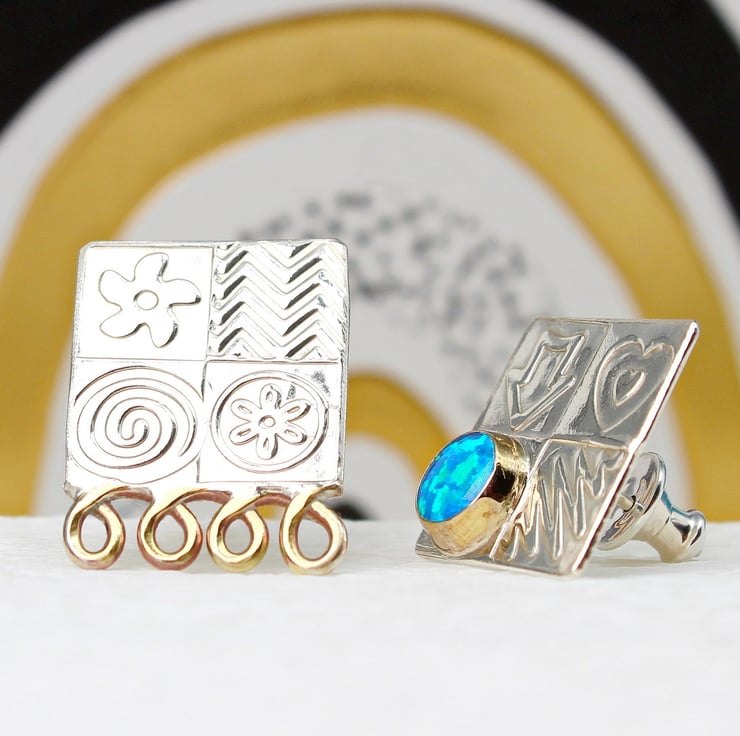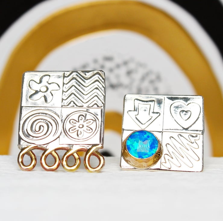 These handmade ear studs come deliberately mismatched, one with a gemstone and one with some brass decoration. They are made from sterling silver and feature one of our wonderful 6mm, lab. grown, Blue opal triplet gemstones set in a brass bezel. We have designed the stencils and patterns, which have been embossed by hand into the silver to make an interesting surface pattern. These ear studs measure 15mm x 15mm and the ear posts and backs are made from sterling silver. We also make a matching pendant.