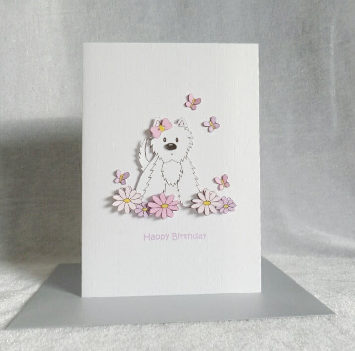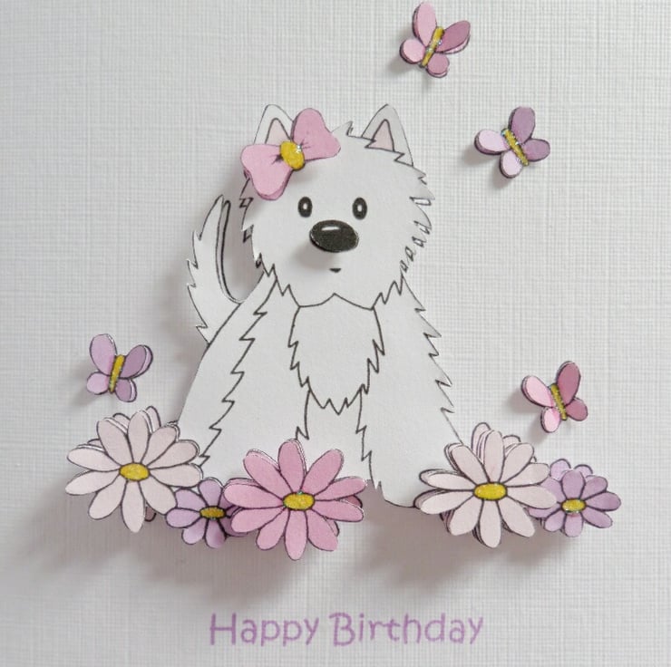 This cute Westie birthday card has been created using my own decoupage, designed from my own original artwork. The A6 card has been made using good quality linen embossed white card and comes with a silver coloured envelope. I have also added a little bit of glitter sparkle to finish the card off.