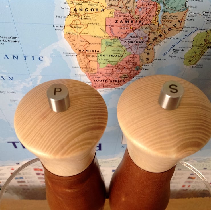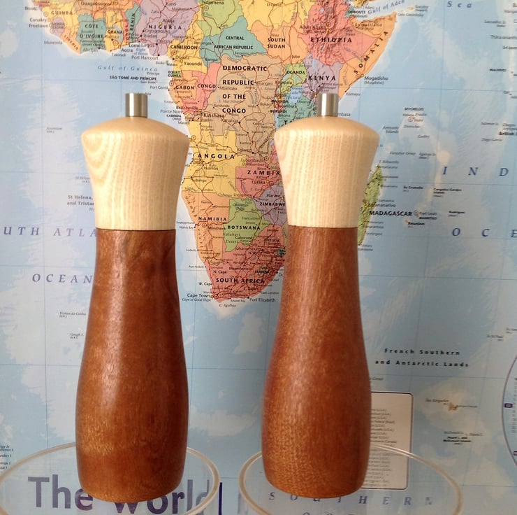 A matching pair of Salt & Pepper mills were hand made by me using recycled materials, the body being made from Mahogany (ex bedroom furniture) and the top section from Ash.