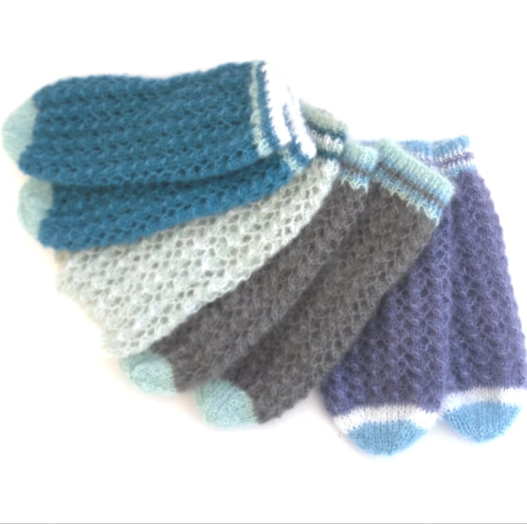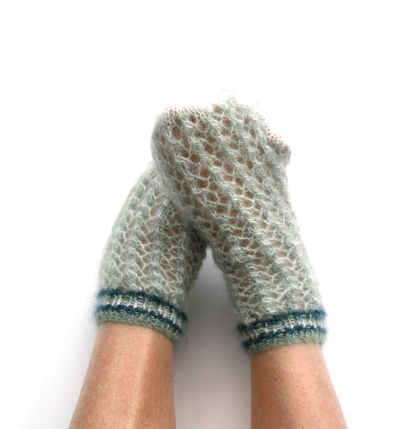 Custom made specially for you - Wonderfully soft hand knit luxury bed socks. Pretty feminine knit. Hand knitted in kid silk mohair (mix of mohair and silk) , so soft and luscious. These simply slip on the feet for wearing in bed.