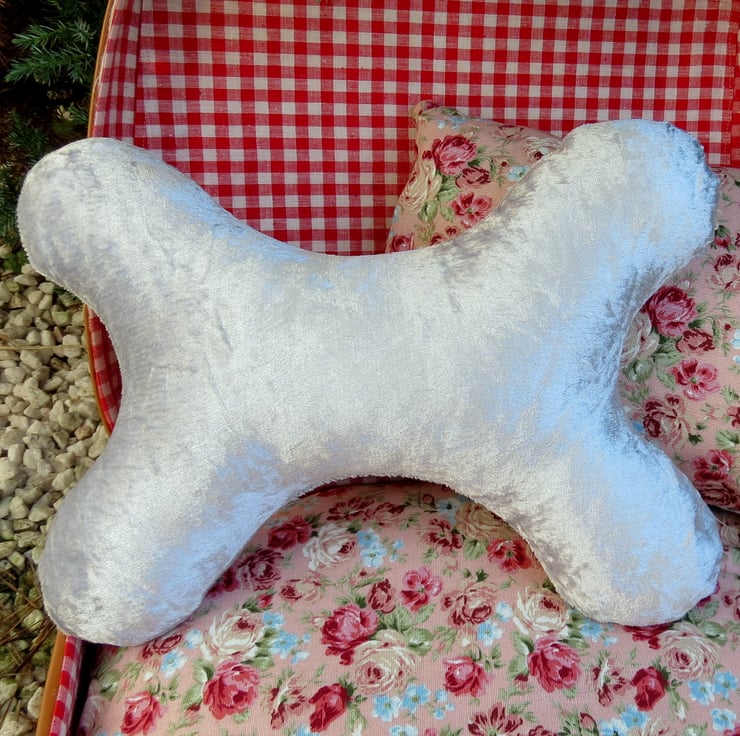 The silver bone shaped cushion has a fixed cover, and has been made from a crushed velvet fabric.