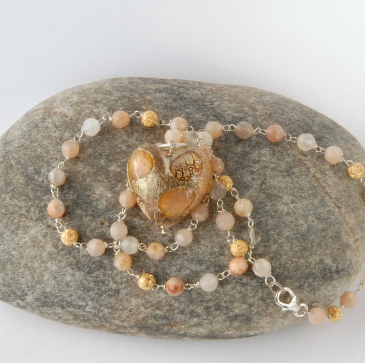 This feminine necklace features a removable murano glass heart pendant which hangs from a delicate chain of peach coloured sunstone beads interspaced with stardust finished gold plate beads. The murano heart was purchased direct from the maker during a trip to Murano and is made from peach amber coloured glass which has been covered in white gold foil and then had spots of opaque (ish) peach and clear glass applied, very unusual and luxurious, I've not seen any like this since. The beaded necklace is made from individually rosary linked (on sterling silver wire) sunstone beads in shades of peach, grey and white along with stardust gold plate beads, the gold plate beads along with the facets on the sunstone beads give a subtle sparkle to the necklace. The heart can be removed so could be threaded onto a piece of velvet ribbon and worn as a choker (not included) or the bead necklace could be worn on its own during the day and the heart popped back on to go out in the evening - very versatile.