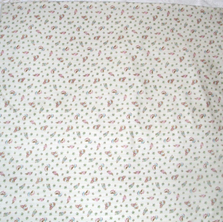 Peter Rabbit and Jemima Puddle Duck and flowers tossed on a cream and pale green striped cot quilt . fully washable and tumble dryable .100cm x 100 cm approx .