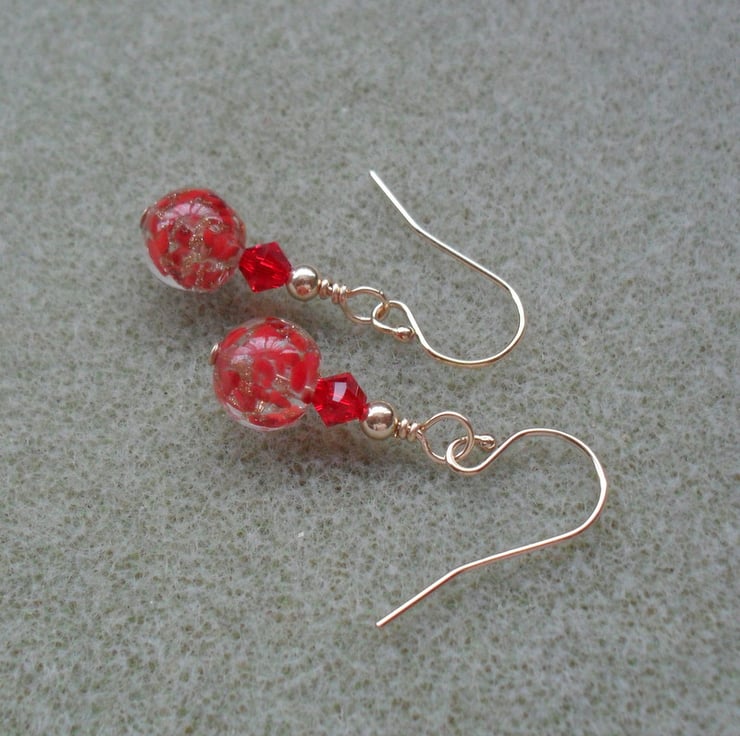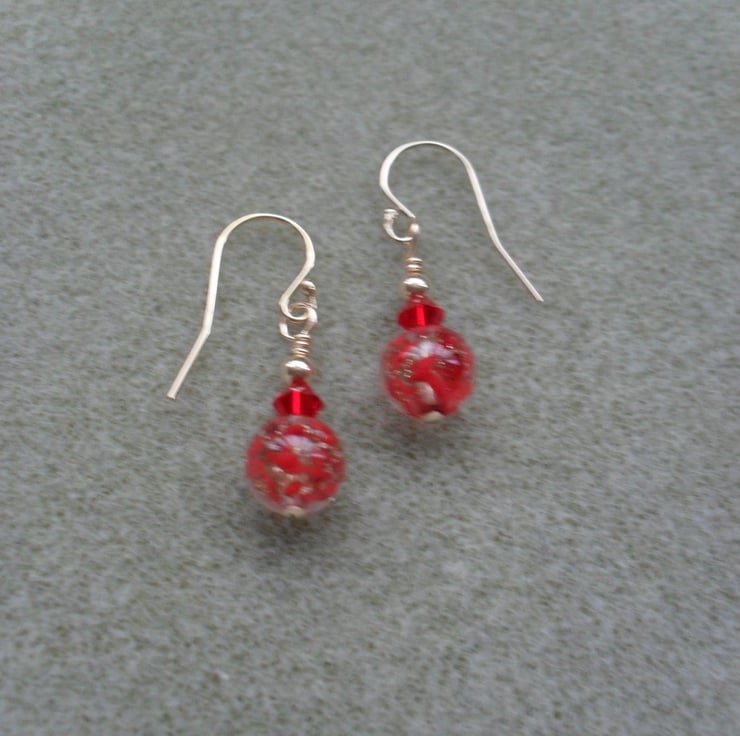 Red Venetian Murano glass beads with aventurina which give them a lovely golden sparkle, and small red swarovski beads are attached to gold filled ear wires.