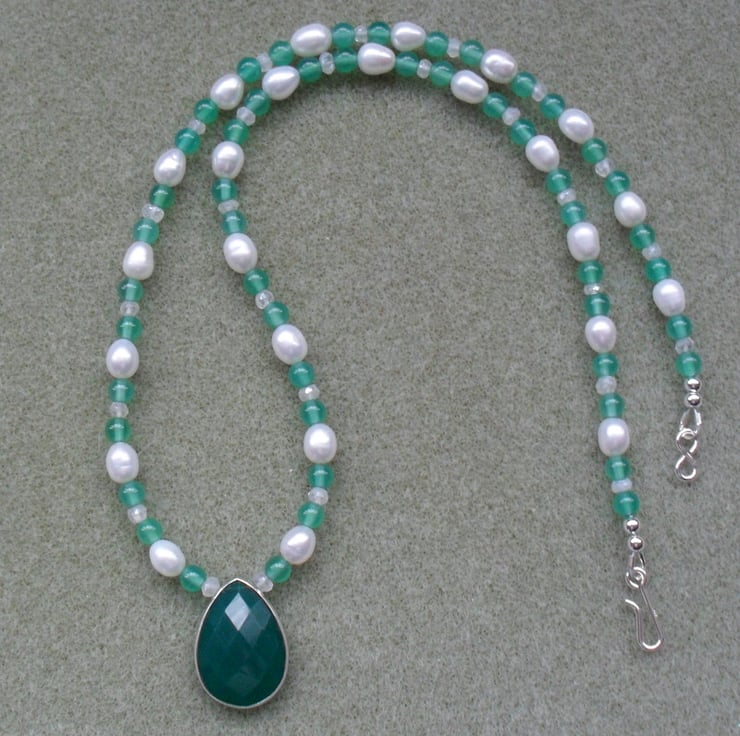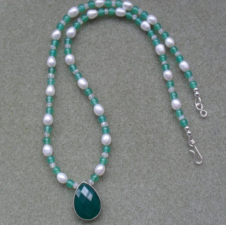 Green onyx drop pendant which is set in sterling silver is attached to a beaded necklace of 4 mm green agate beads, small white quartz which have been coated to give them a little sparkle and small freshwater cultured pearls.