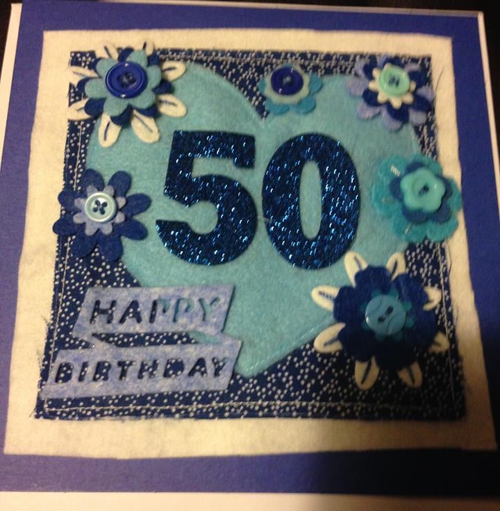 A lovely felt and fabric machine and hand sewn 50th birthday card
