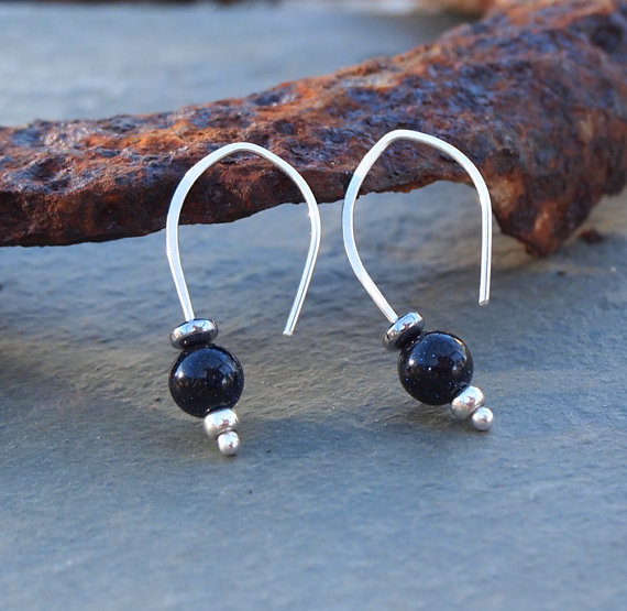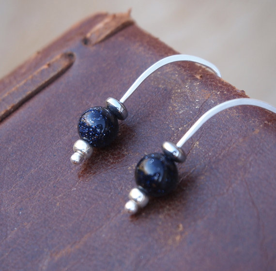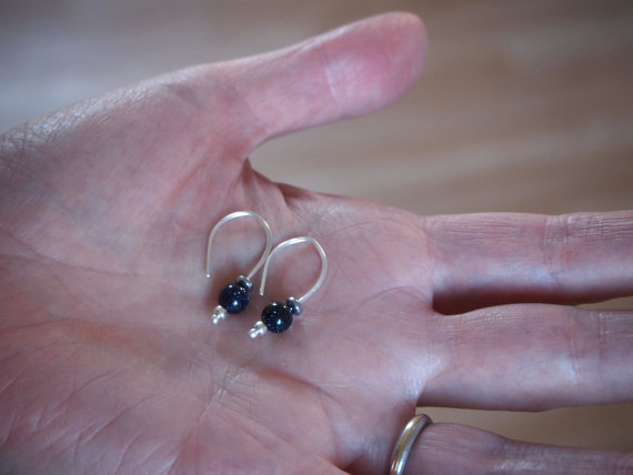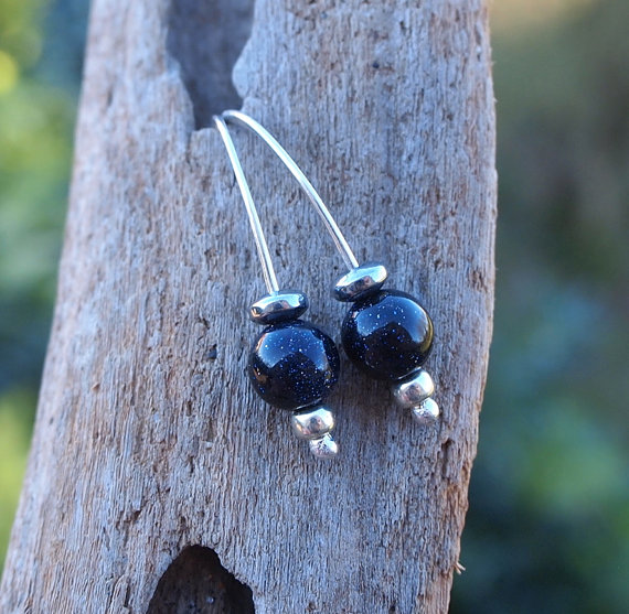 Dark indigo blue goldstone spheres have been teamed up with small silver seed beads & hematite to make these simple drop earrings.