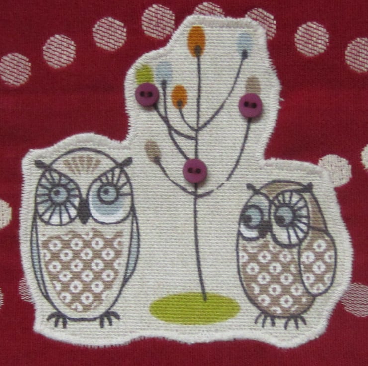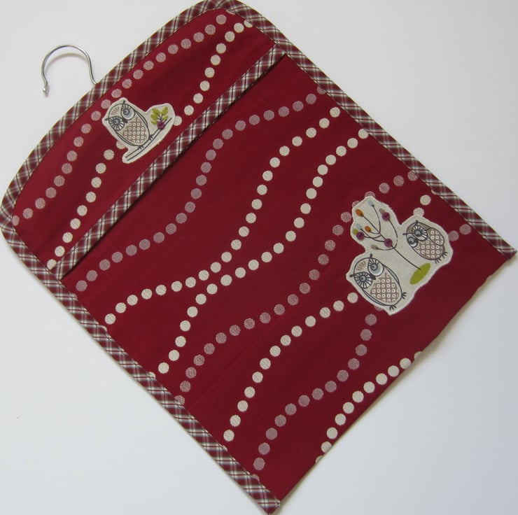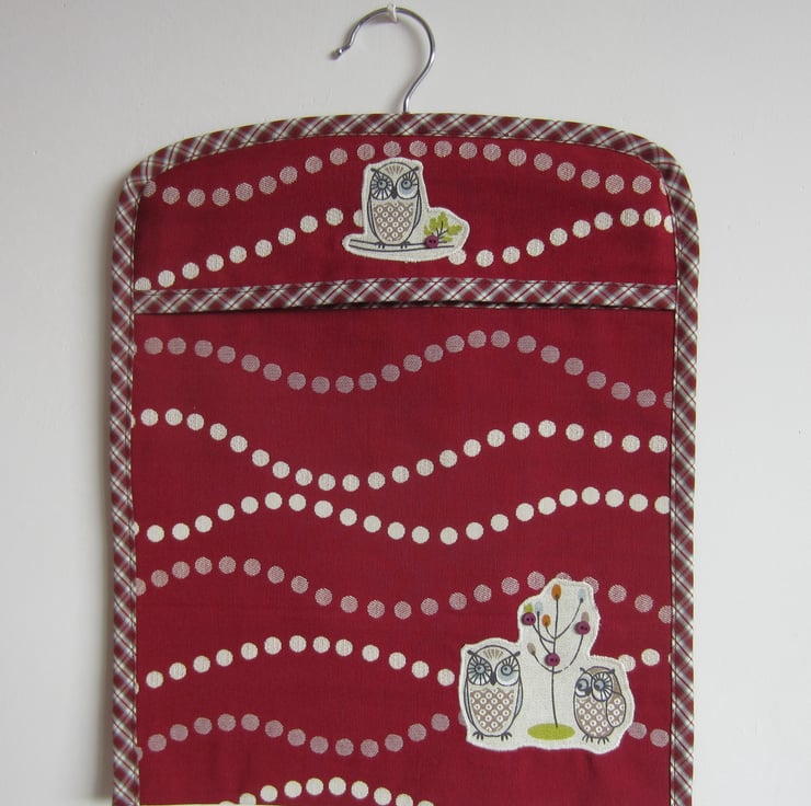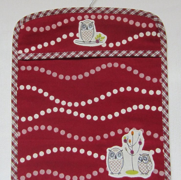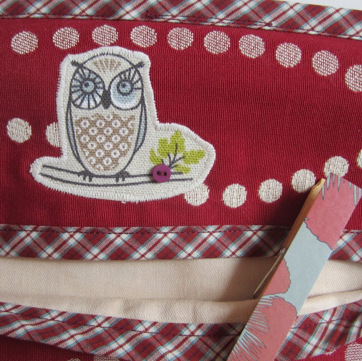 Sturdy dark red with cream spots peg bag, edged with check bias binding and decorated with appliqued owls and mini buttons. Fully lined in a cream fabric.
