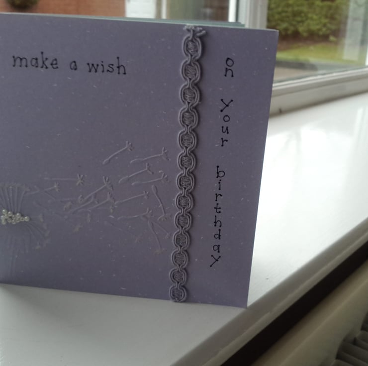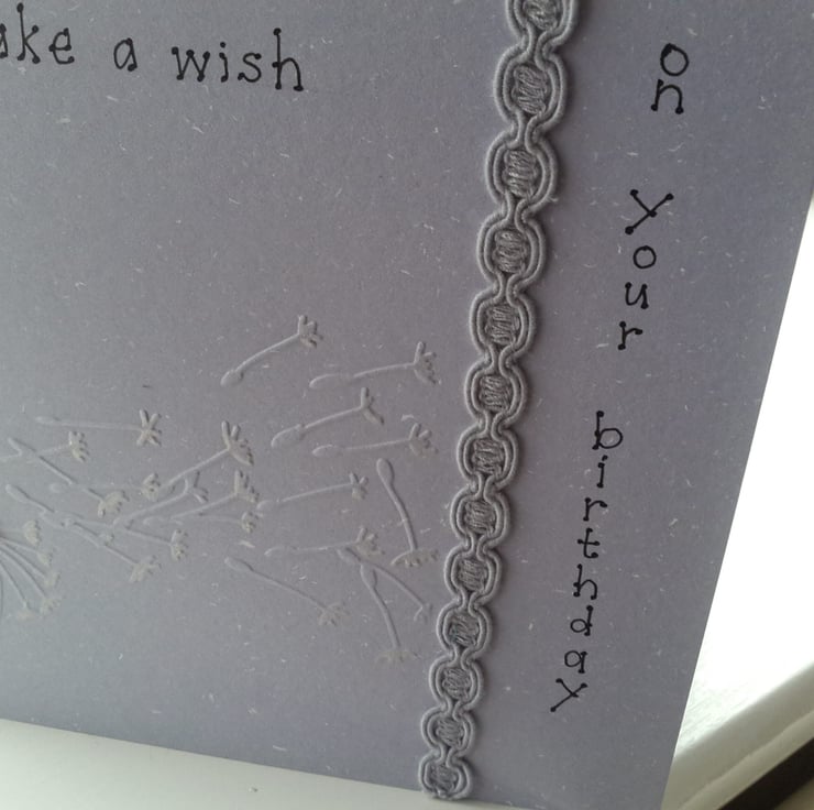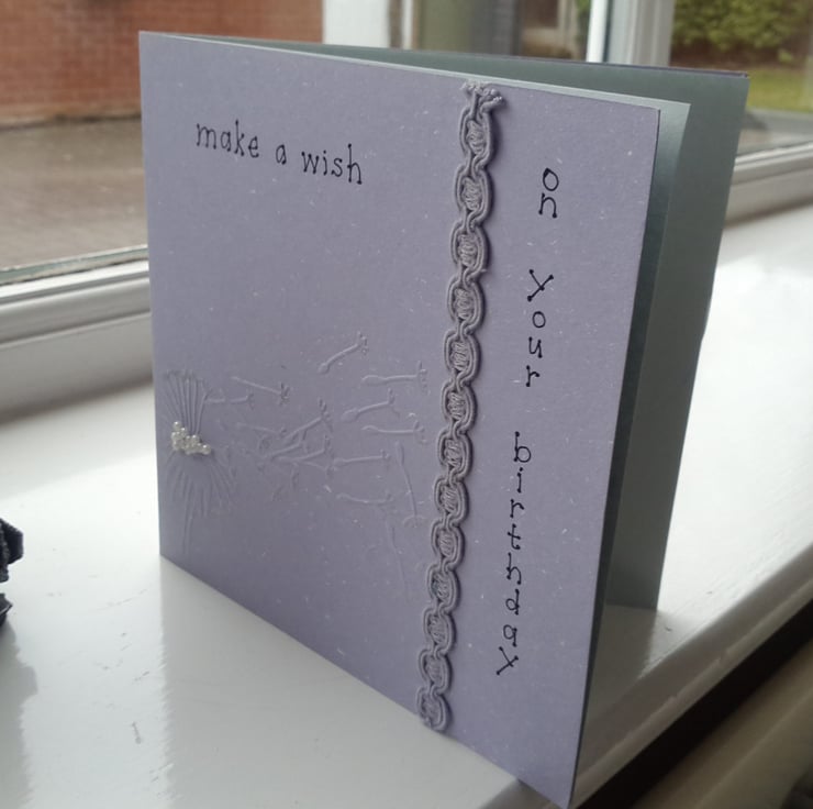 A completely handmade and uniquely designed card. Consisting of quality pale grey/ white flecked card which has a beautiful dandelion head with seed heads blowing in the wind embossed. Decorated with pearl beads and grey fancy cotton ribbon. The words make a wish on your birthday handwritten in black ink.