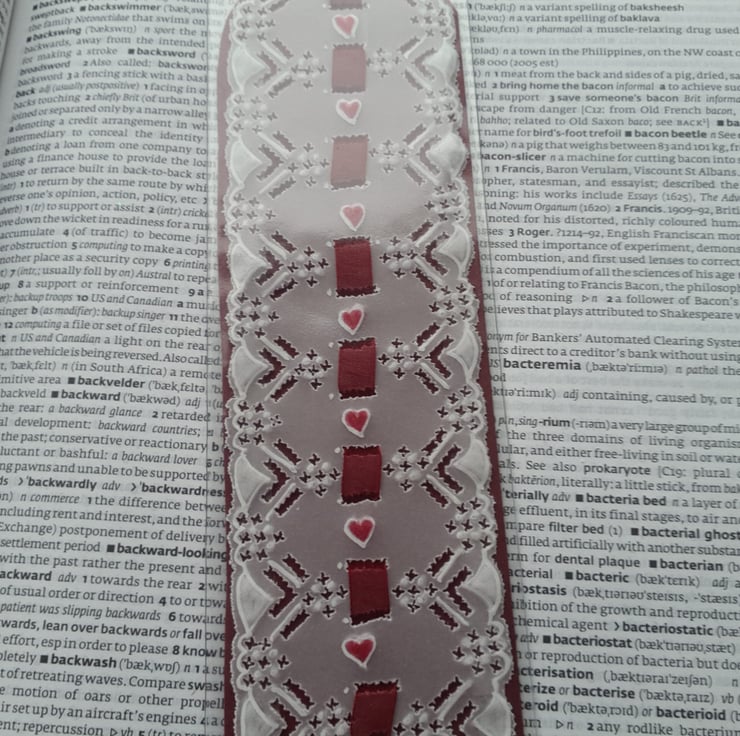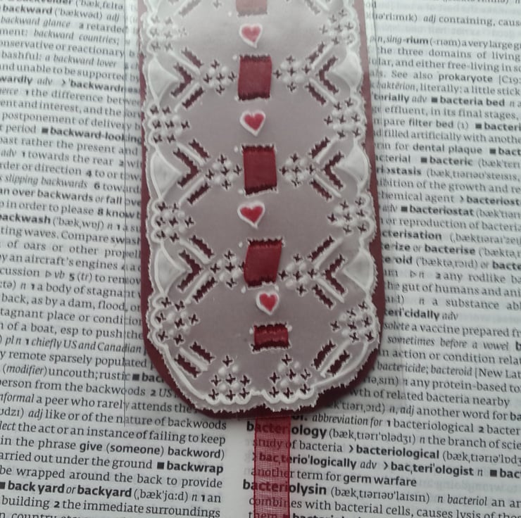 A completely handmade and uniquely designed bookmark. Consisting of parchment which has been cut embossed and pierced with a delicate heart pattern. All edges have pretty lacy pattern. A row of hearts down the centre of the bookmark along with dark red organza ribbon which has been threaded through. Mounted onto quality dark red card.