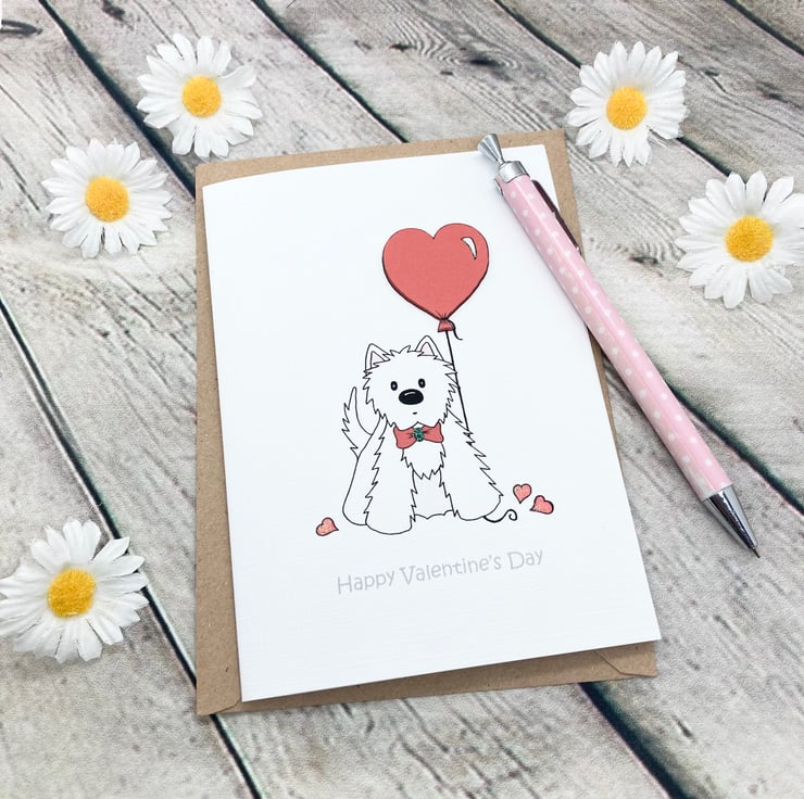 This Westie card has been handmade using my my own original artwork, with a decoupaged heart balloon. I have added a bit of glitter detail to give the card a bit of sparkle.