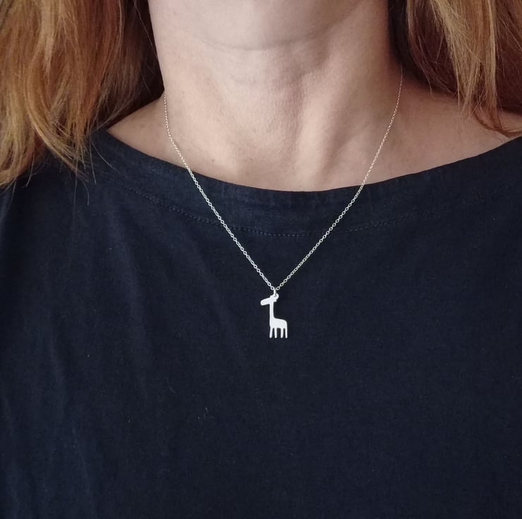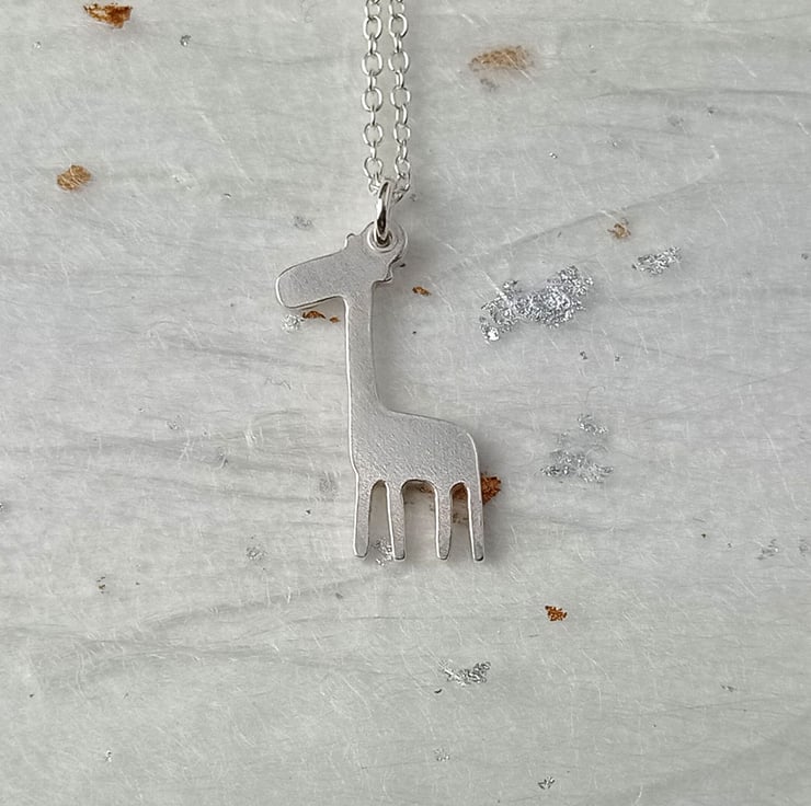 I have made this giraffe necklace by cutting recycled sterling silver by hand. After filing and finishing, it was attached to a sterling silver chain. It is part of a collection of animal jewellery, which includes matching giraffe earrings.
