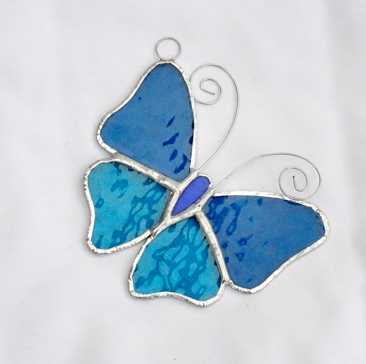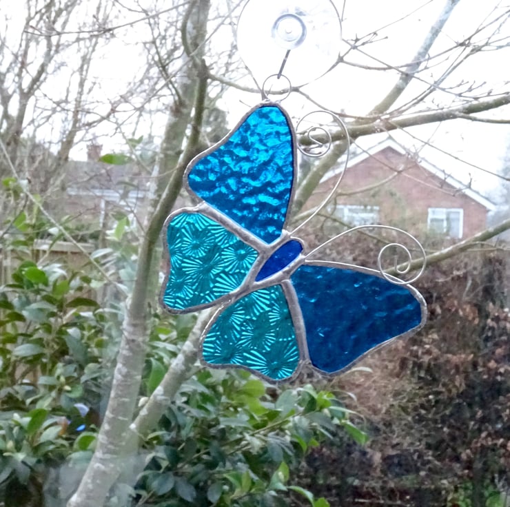 This little stained glass butterfly has been made from turquoise textured stained glass for the wings and blue glass for the body.