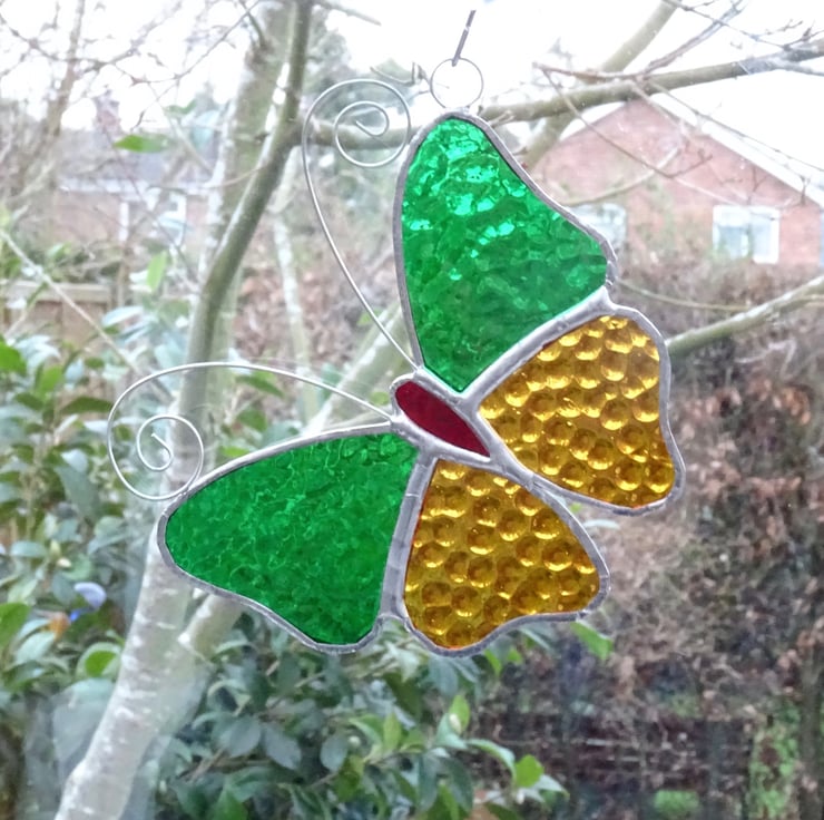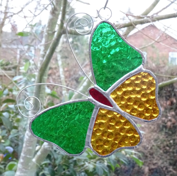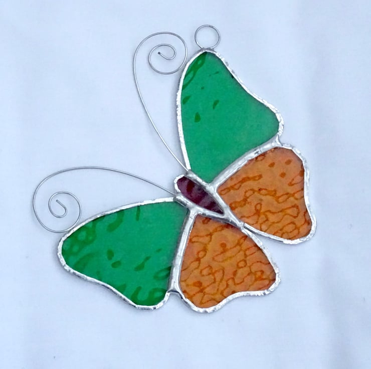 This little stained glass butterfly has been made from green corella stained glass and amber hammered glass for the wings and red glass for the body.