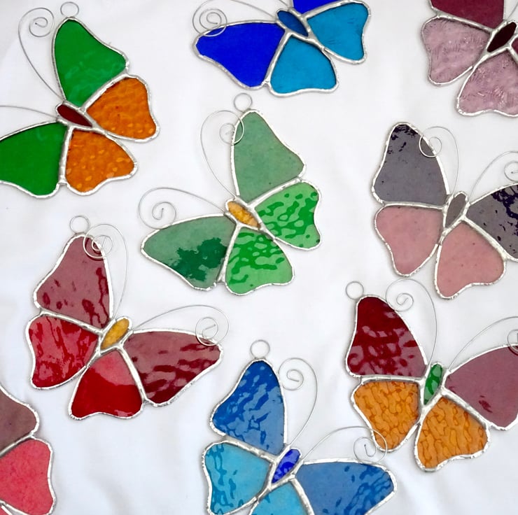 The butterfly measures 12 cms across by 9 cms excluding antenna. This would be lovely hanging in any window or even on a mirror, and they look especially good if hung in pairs or more. Did you know the collective noun for a group of butterflies is a kaleidoscope?