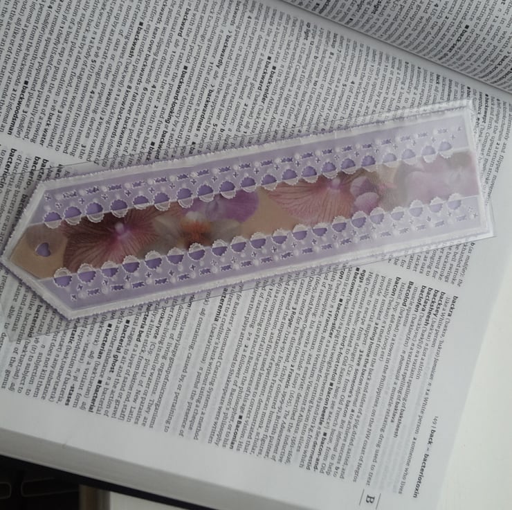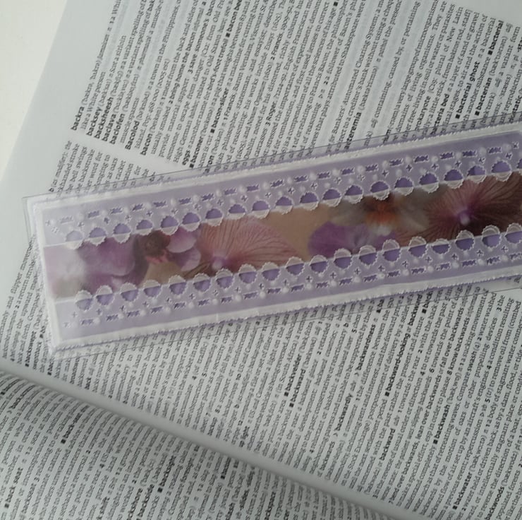 A completely handmade and uniquely designed bookmark. Consisting of parchment which has been embossed cut and pierced with a delicate lacy design. A central panel of hydrangea printed vellum. Mounted onto lilac vellum.