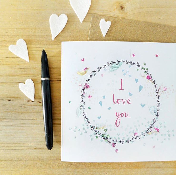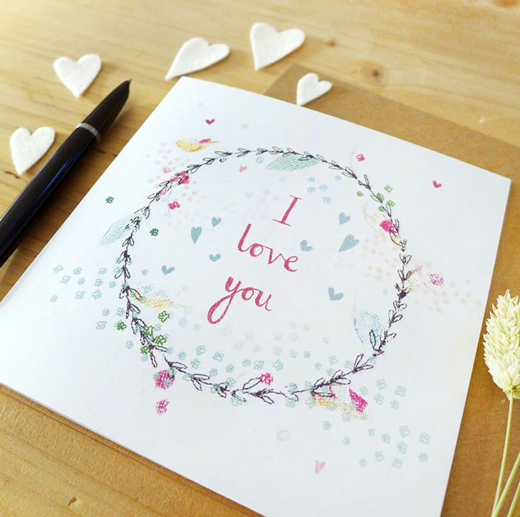 A beautiful 'I Love You' card featuring an embroidered floral wreath with appliquéd fabric and paper pieces. The original wreath embroidery has been turned into a pretty printed card. Perfect for Valentine's Day or just to tell someone how you feel.