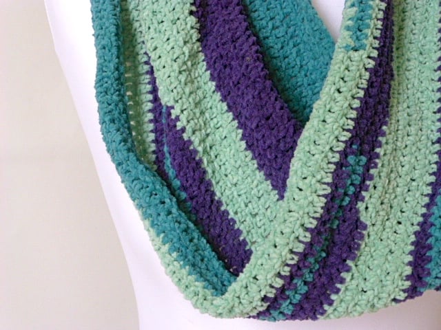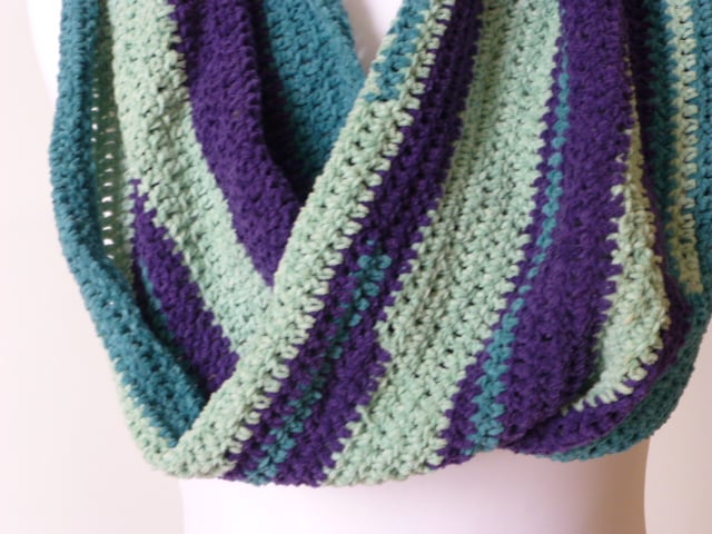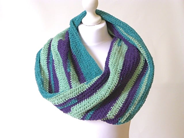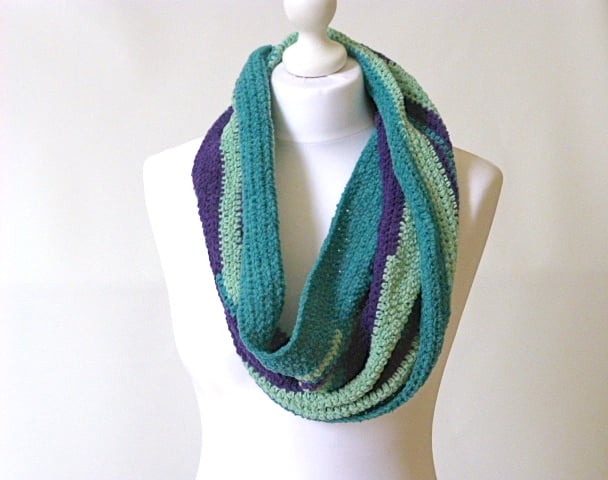 Colour - turquoise, sea green and rich purple. This yarn is no longer available so it's a never to be repeated cowl.