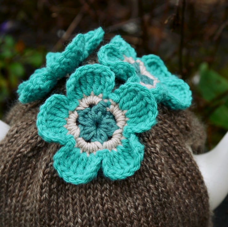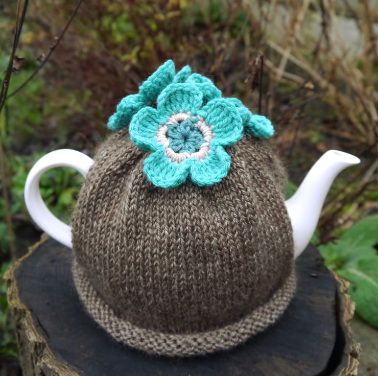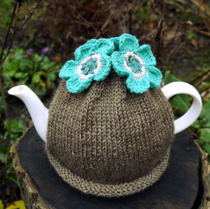 A wonderfully soft and warm brown tea cosy with pretty teal and turquoise flowers. I have hand knitted the brown cosy using a lovely quality aran yarn. The three flowers are crocheted in shades of teal and beige. It will fit a standard 4-6 cup teapot and is fairly stretchy to accommodate different styles of teapot.