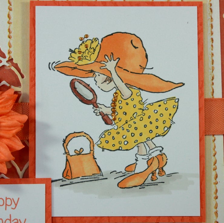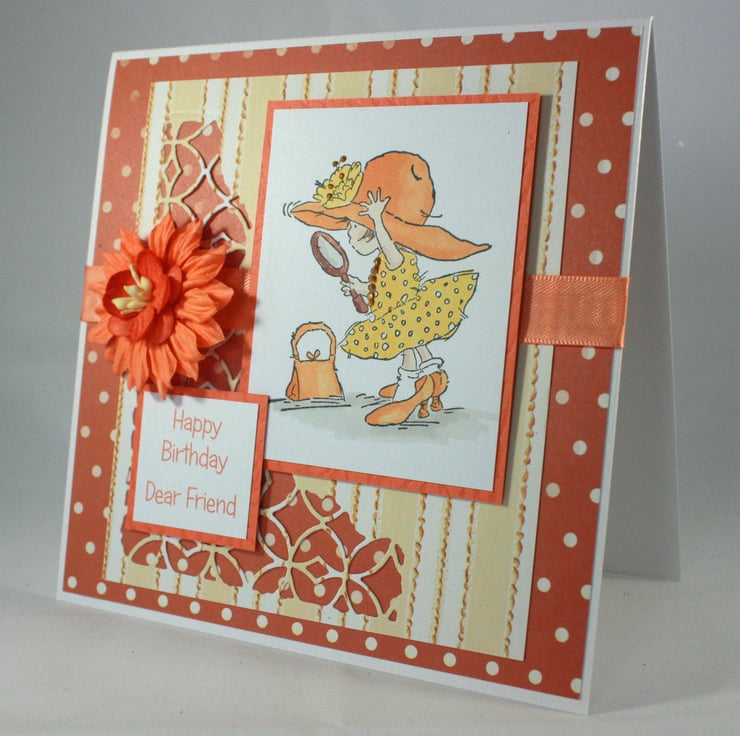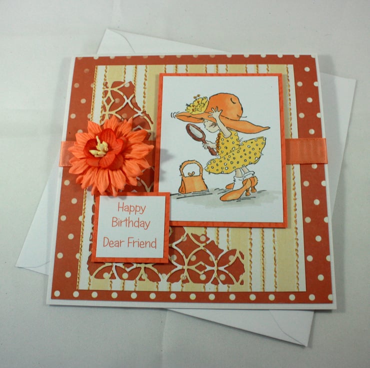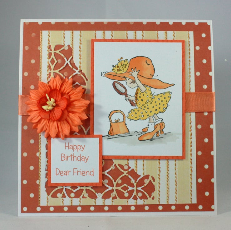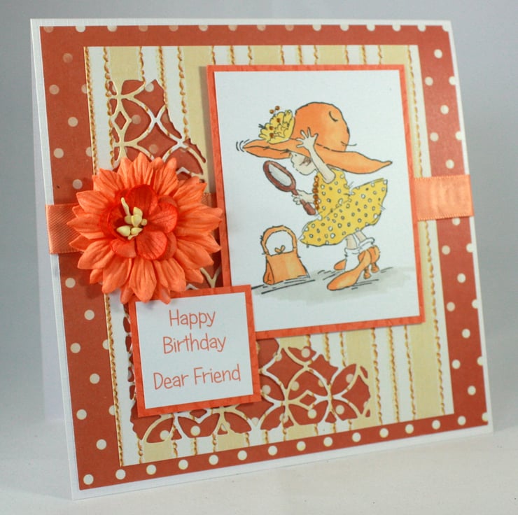 The image has been layered over striped paper with a die cut pattern and a spotted orange background. The card is finished with a length of orange satin ribbon, orange paper flowers and the printed message: 'Happy Birthday Dear Friend'.