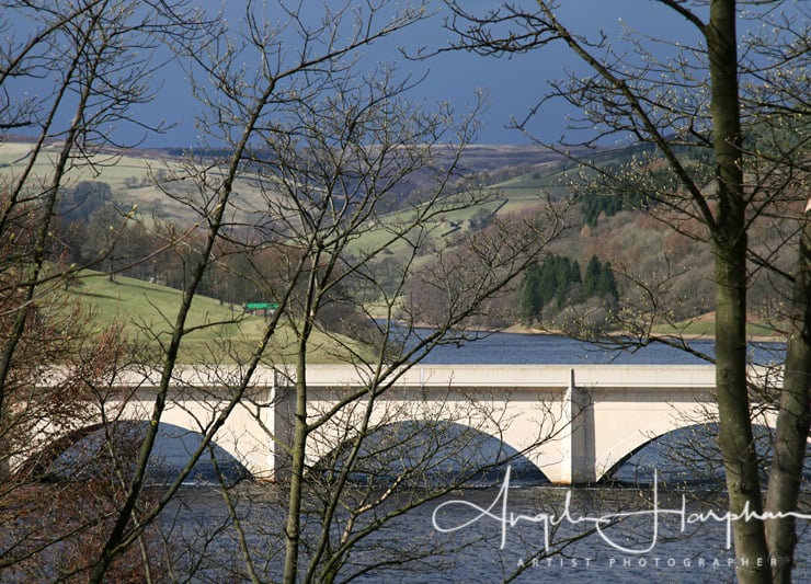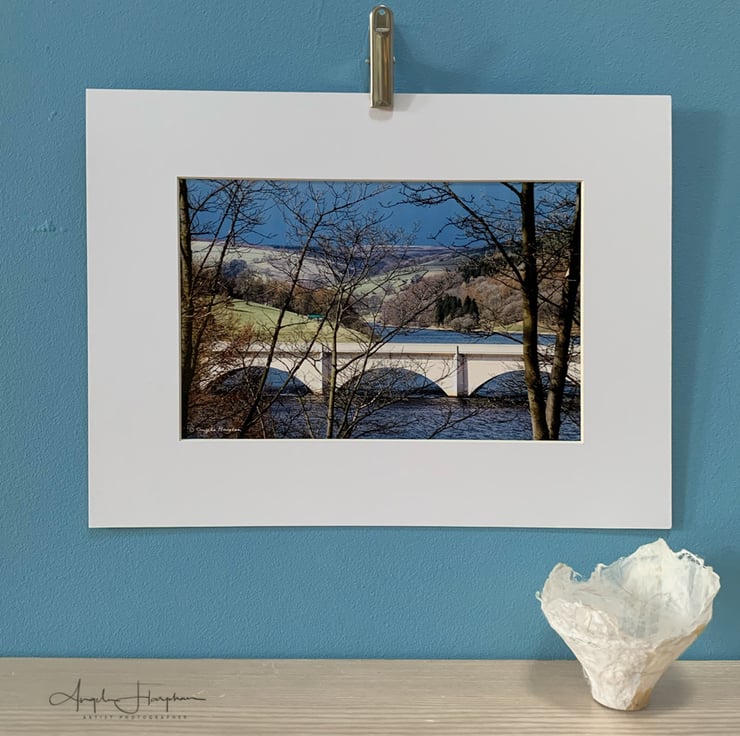 A fine art colour photograph of the Ladybower Reservoir with Viaduct glimpsed through the bare trees in the Derbyshire Peak District near Sheffield. Inkjet printed onto good quality glossy photo paper and mounted using Snow White mount board.