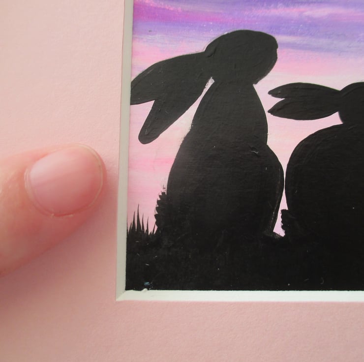 ACEO (Art Cards Editions and Originals) paintings measure just 2,3 x 3.5". My bunny ACEOs are mounted in specially cut mount boards to fit into a standard 6 x 4" frame. Each ACEO could be removed from the mount and stored in an ACEO collectors wallet if preferred.