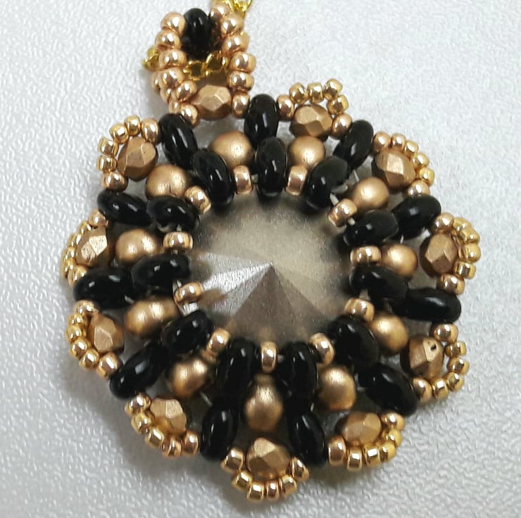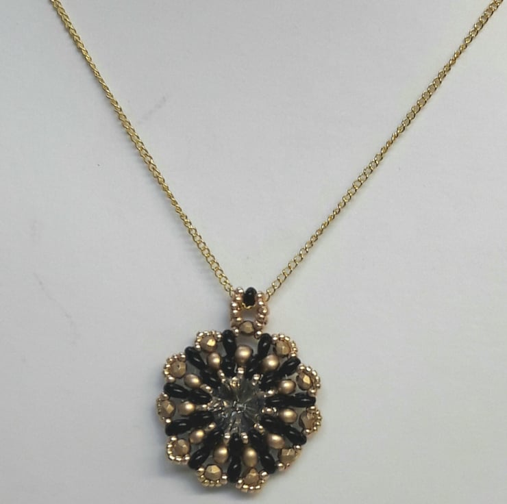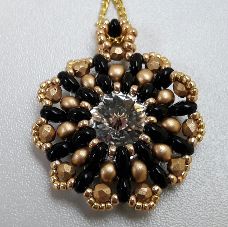Designed and handmade by Rachel Smith of beads by verchiel. Beaded by hand with specialist needle and thread for beadweaving. I have used a 14mm clear Swarovski crystal rivoli which is a bead without a hole. The beadwork is cleverly designed so that the beads encase and hold the rivoli in place. The beads used are toho metallic seed beads, 2mm Czech crystals and Czech twin hole beads. Pendant is on gold plated chain approx 18 inch length with lobster clasp fastening. Comes wrapped in tissue paper and in an organza bag.