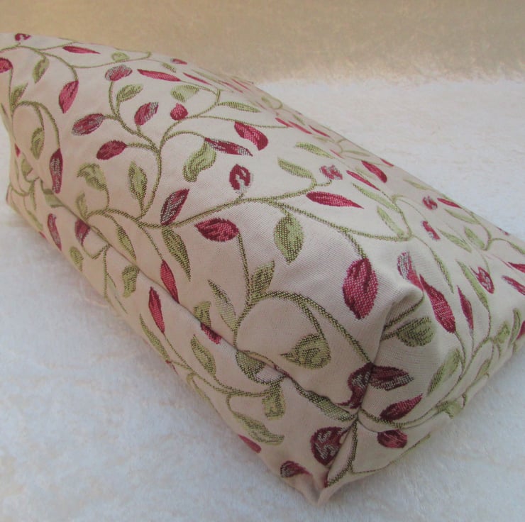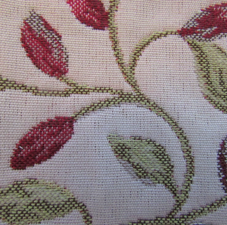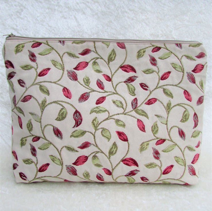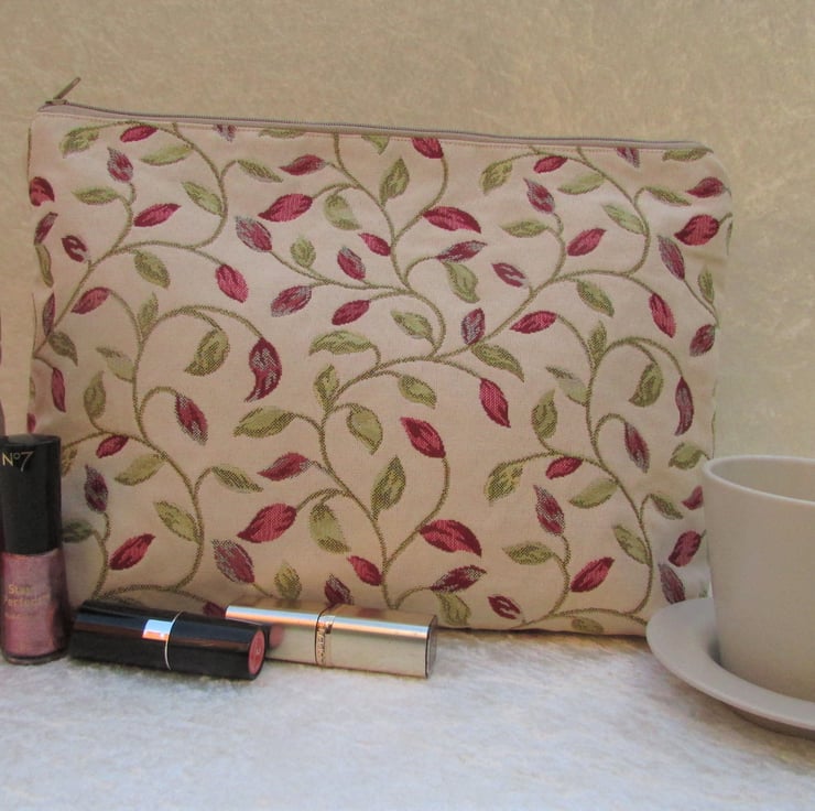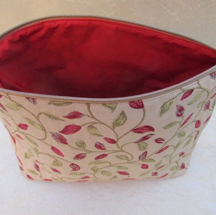 A pretty toiletry bag, wash bag in cream fabric with a woven leafy foliage pattern in shades of green and red. The bag has a zip fastening and the inside is fully lined with a red waterproof lining. The base of the bag is boxed giving a spacious interior.