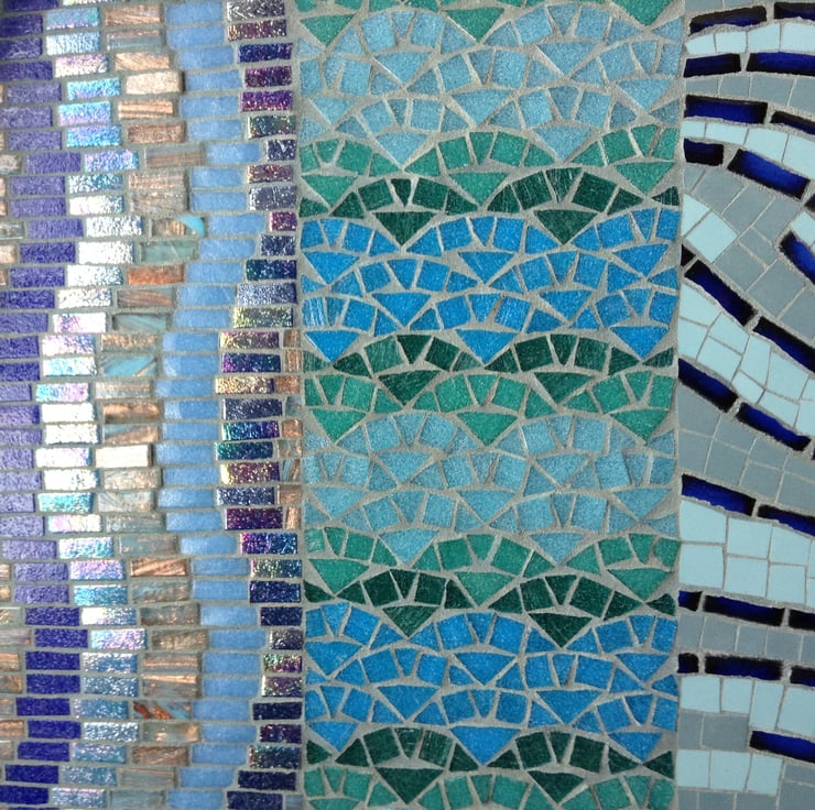 Blue mosaic panel based on patterns and textures of fish scales, using variety of different materials (e.g. ceramic, mirror, vitreous glass, tile). Measures 48 cm x 32 cm - needs fixings on back (e.g. D-rings, mirror plates) if wished to wall-hang rather than stand this but could be displayed either portrait or landscape orientation. Price includes packing and postage at special delivery rate or equivalent and any returns would expect to be at similar. Unable to post to addresses outside UK.