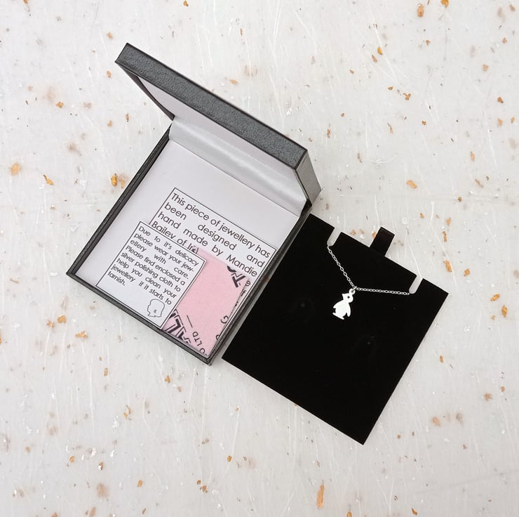The necklace will arrive in a black jewellery box, complete with simple care instructions and a small square of silver polish.