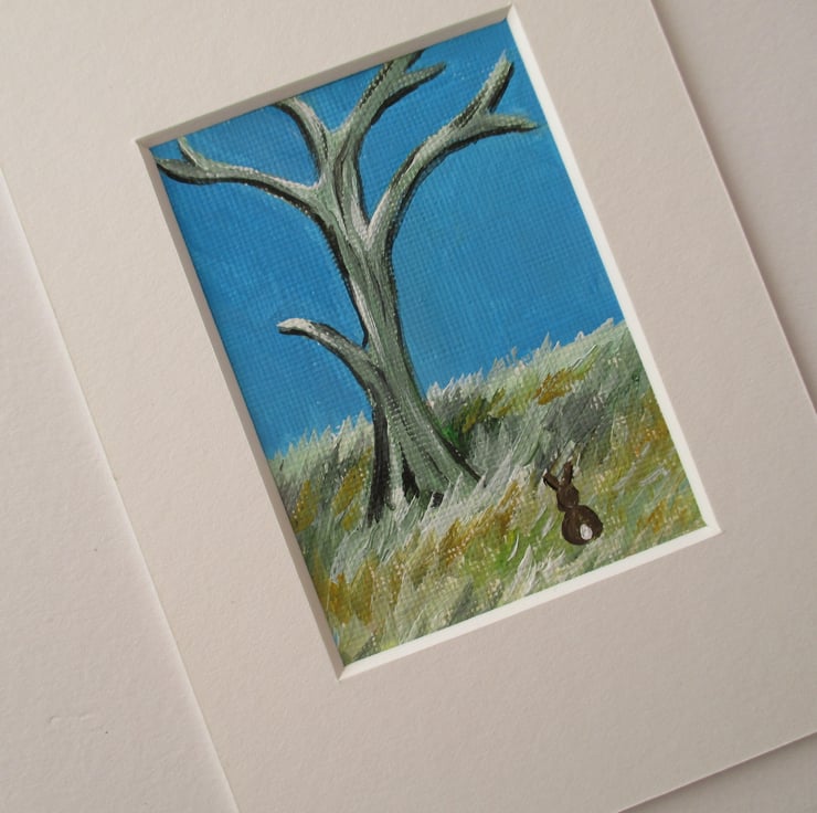 ACEO sized original bunny rabbit painting mounted ready to fit into a 6 x 4 inch frame.