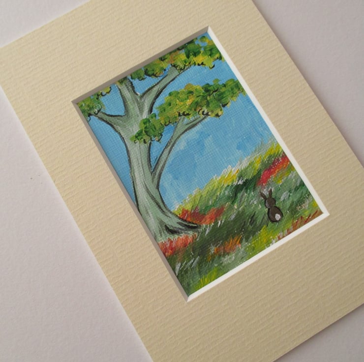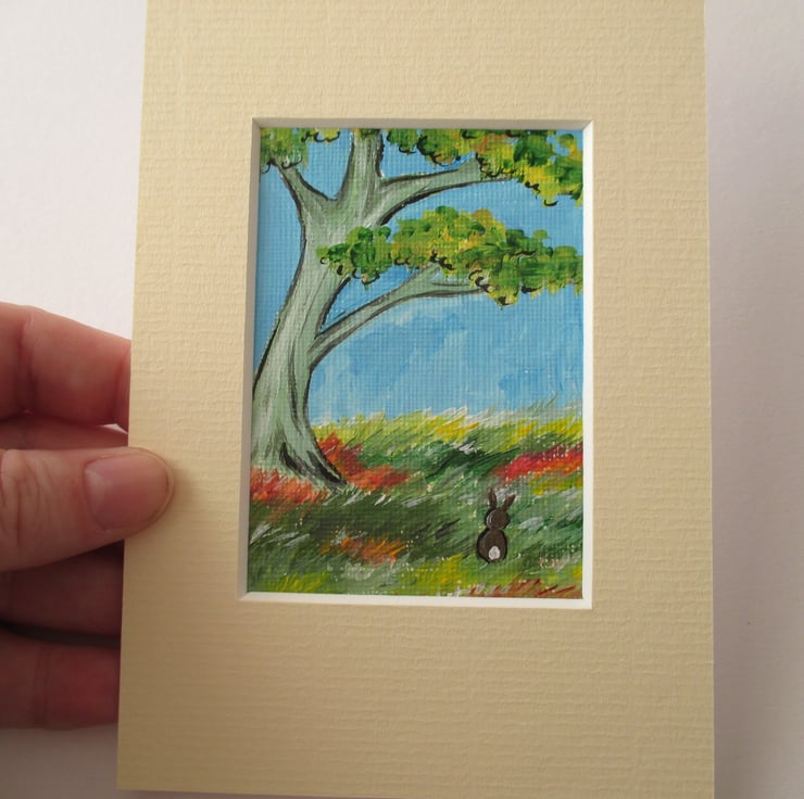 ACEO sized original bunny rabbit painting mounted ready to fit into a 6 x 4 inch frame.