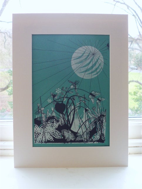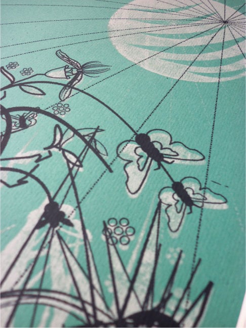 The Sun shines onto the butterflies and foliage of flowers and weeds. I have used two colours for printing: white and dark blue.