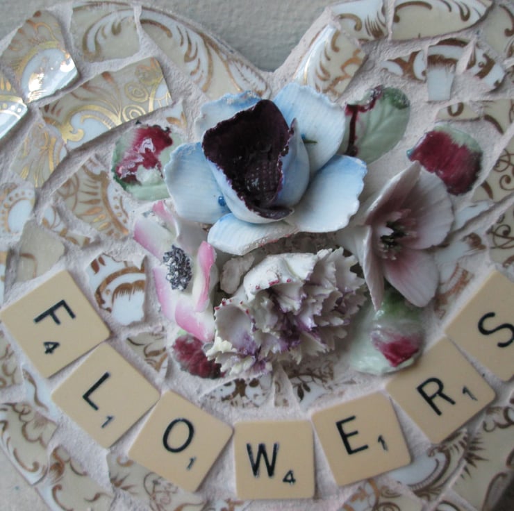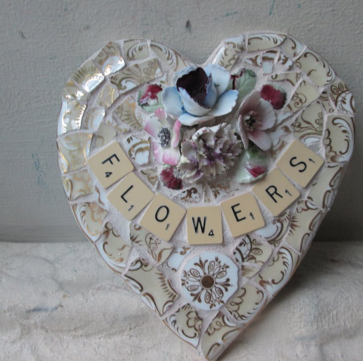 Valentines is approaching and time to give a gift that is more lasting than flowers. This mosaic heart is made from Vintage Pottery and Scrabble tiles it is 17cm x 20cm in size and has a hanging attachment on the back.