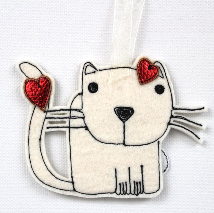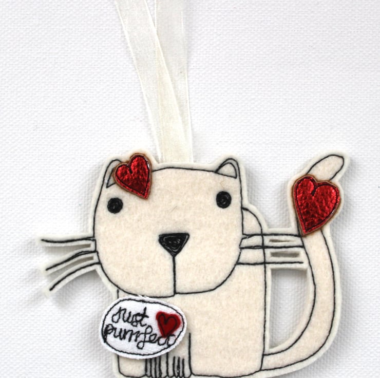 Meet 'Just Purrrfect Kitty', she wears a sewn red metallic heart on her head, has a red metallic heart on her tail with a sewn fabric label 'Just Purrrfect'. Kitty is made using 3mm thickness, 100% wool felt.