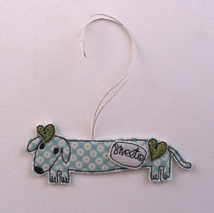 A sewn fabric sausage dog, in a green, flower speckled fabric, with two sewn lime green glitter hearts and a sewn fabric label 'sweetie'. A cream coloured string to hang your decoration.