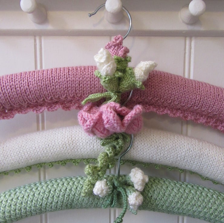 A beautifully hand knitted ladies coat hanger with three knitted rose buds tied in a posy under the metal hook.