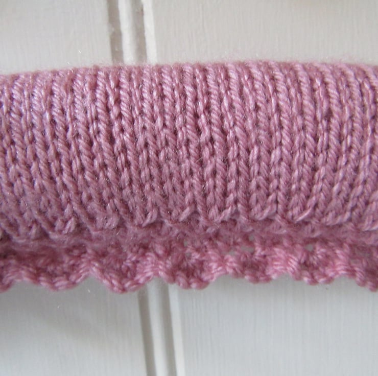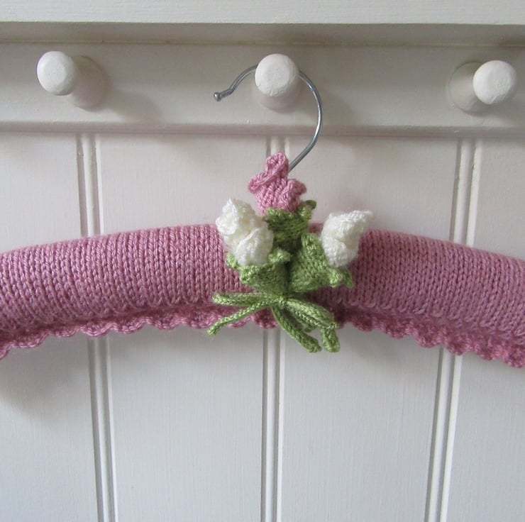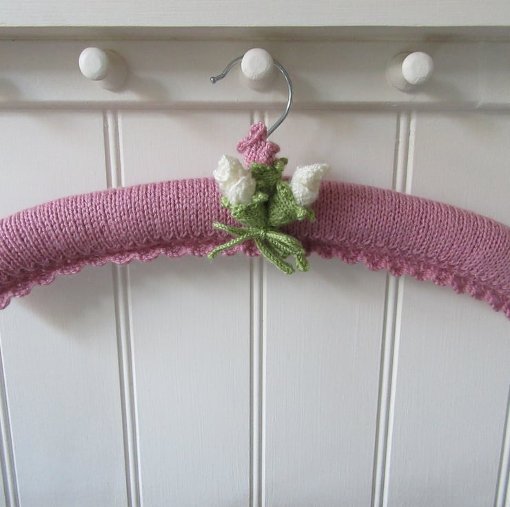 The wooden hanger is padded with polyester wadding and overlaid with a hand knitted dusky pink cover. The cover uses several stitches to create a lovely lace and feminine picot edging.